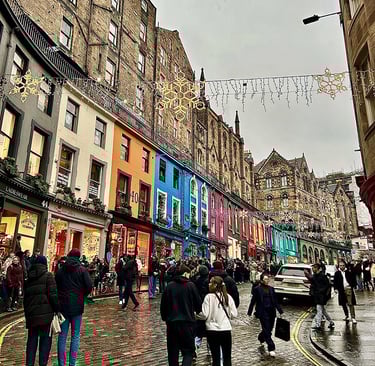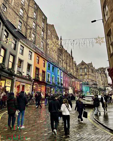 Notre route nous mène ensuite sur la jolie rue colorée de Victoria Street qui est d’ailleurs l’une des seules à avoir quelques illuminations de Noël. Il n’est pas 10h, mais celle-ci est déjà bondée et une longue file d’attente s’est déjà formée pour entrer dans le magasin Museum of Context, bien connu des fans de Harry Potter, et c’est plutot impressionnant. Plus bas, un magasin de décorations de Noël, ouvert toute l’année, nous fait de l'œil et nous n’en ressortirons d’ailleurs pas sans un petit ornement pour le sapin. Nous faisons ensuite le tour de Grassmarket, cette place du marché bordée de pubs et de quelques magasins, puis montons les escaliers de The Vennel, qui offre un joli point de vue sur le château d’Édimbourg, mais où, ici encore, nous devons jouer un peu des coudes et nous faufiler pour pouvoir profiter du paysage.