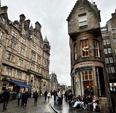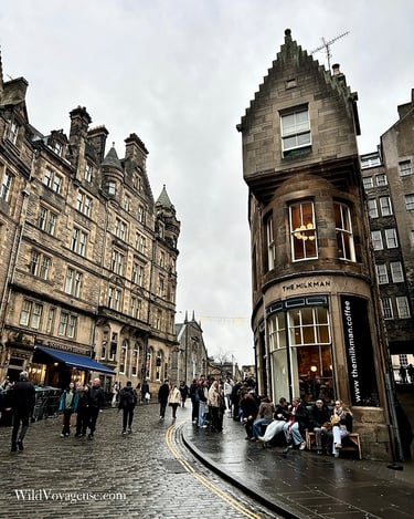 En cette première journée complète sur place, nous nous réveillons assez tôt et passons prendre un petit quelque chose au Starbucks, proche de l’appartement, avant de partir en vadrouille dans la vieille ville d’Édimbourg. Il n’est pas encore 9h, le jour est à peine levé et une légère brume recouvre les rues, ce qui donne à la capitale écossaise un aspect encore plus mystérieux qu'à l'accoutumé. Nous passons d’abord par Princes Street Gardens, dont une bonne partie est inaccessible lorsque le marché de Noël n’est pas encore ouvert, pour rejoindre la rue de The Mound qui mène à Old Town, la vieille ville. Notre premier arrêt rapide est l'université School of Divinity, dont le parvis accueil un magnifique escalier. Nous continuons ensuite notre chemin en direction du Royal Mile et du château d’Édimbourg. L’ayant déjà visité lors d’un précédent séjour, nous ne le ferons pas cette fois-ci, mais il est fortement recommandé de réserver son billet en ligne et à l'avance puisque ce jour-là, il était complet. Nous montons tout de même jusqu'à la place du château qui offre une belle vue sur la ville, malgré le temps un peu maussade de ce début de journée.